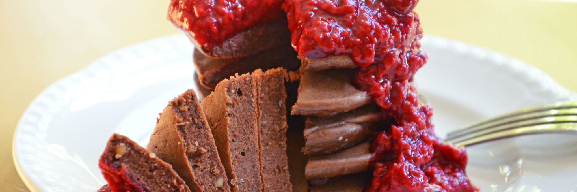 - Serve the pancakes stacked up high with the raspberry coulis poured over the top.
