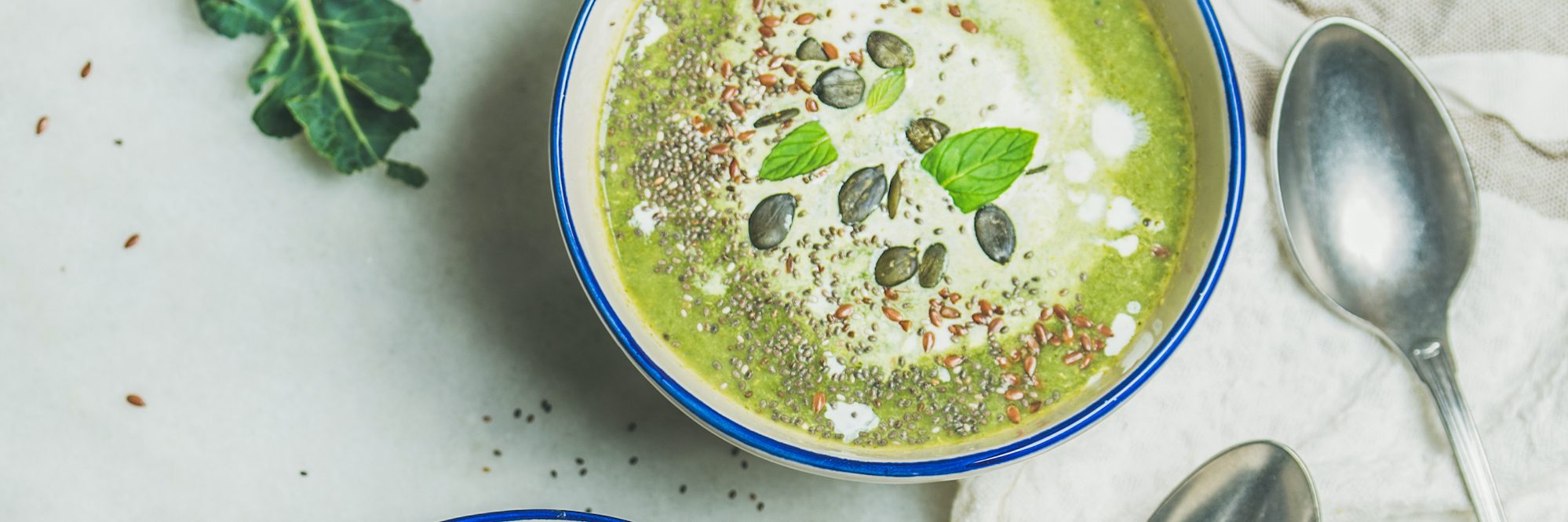 - Serve each bowl with a topping of 1 tbsp cream, mixed seeds and fresh basil leaves.