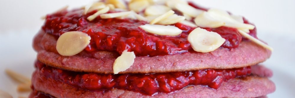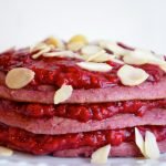 - Serve the pancakes with the stewed raspberries poured over the top, and the almond flakes for a moist and crunchy healthy topping.