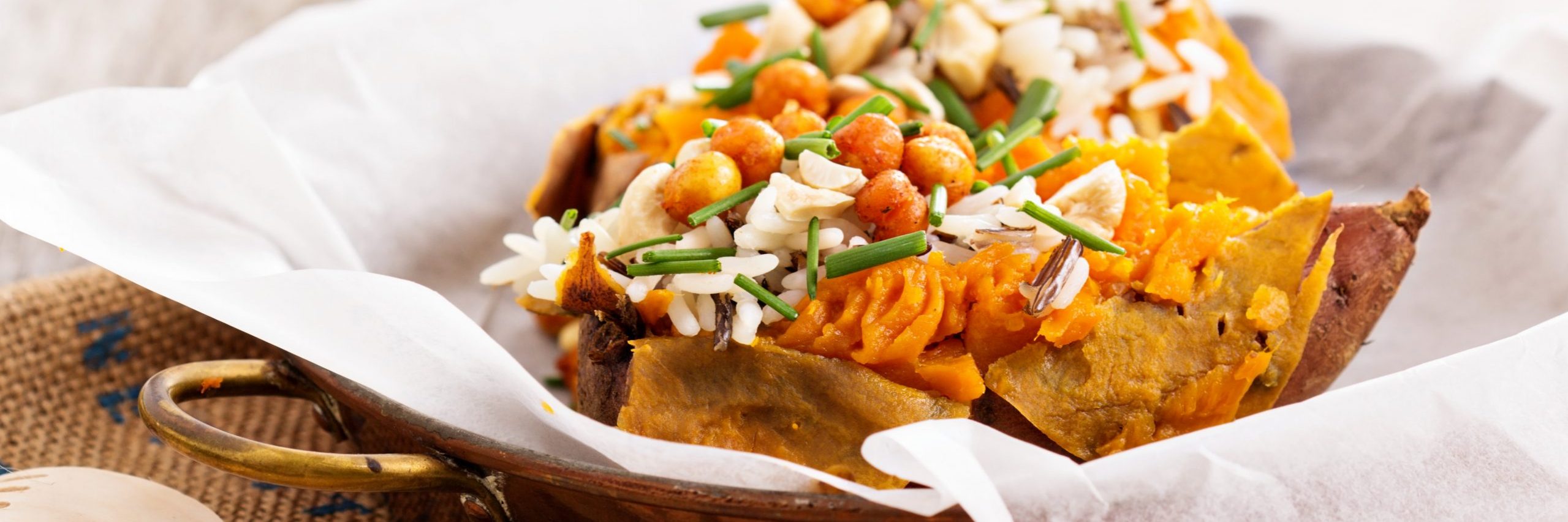 - Serve the sweet potato cut in half, with houmous spread in the middle, and then fill with the chickpea mix and top with fresh chives.