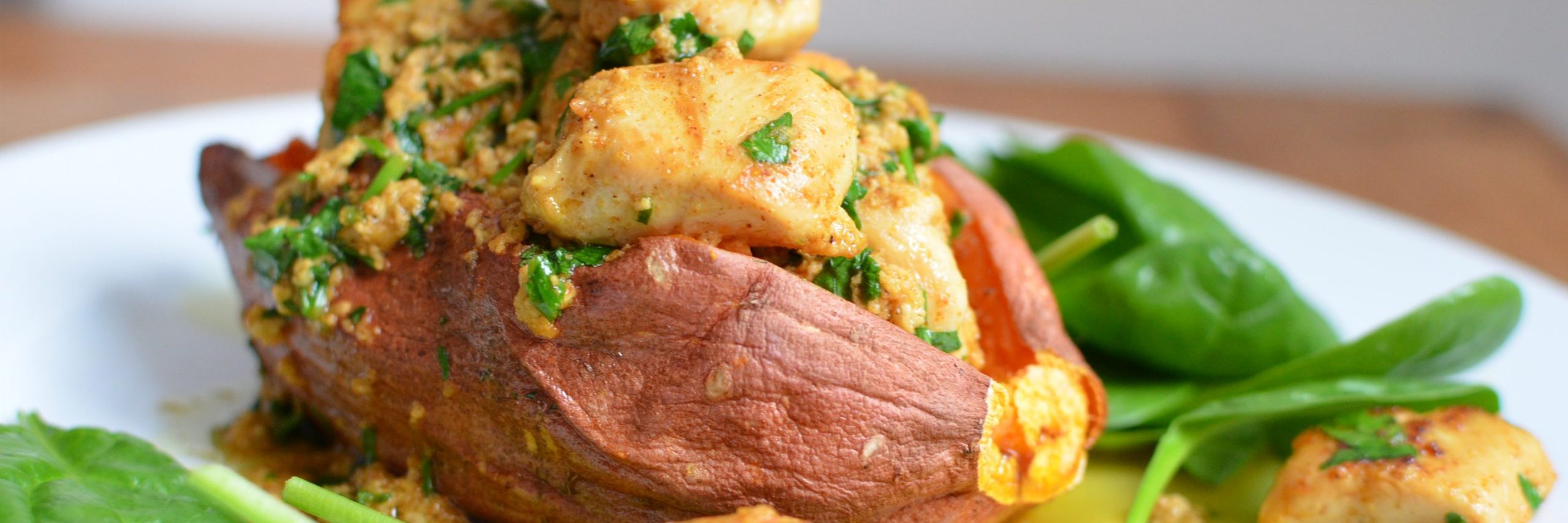 1 sweet potato 150 g chicken breast 1 tbsp coconut oil 1/2 tsp hot curry powder 2 tbsp sour cream or Greek yoghurt 1 handful fresh parsley 1 handful fresh spinach Microwave the sweet potato for 6-8 minutes depending on the size (or bake in the oven for 45 minutes at 180 deg C).